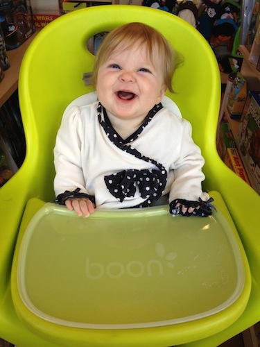 The T is still not running out to us yet, so we Bjorned the baby and took a hike out to Coolidge Corner for lunch and shopping. And we found out the rest of Brookline did the same thing! We had some crepes and then went to Magic Beans to buy a high chair and look at convertible carseats. Kaya had definite high chair preferences – she screamed bloody murder when put in the Tripp Trapp – but liked the Bloom highchair a lot. Unfortunately, that one costs over 500 dollars. We finally decided to go with the Oxo Tot Sprout Chair – and we’re excited about it! (This is Kaya trying the Boon Flair, a close second choice)