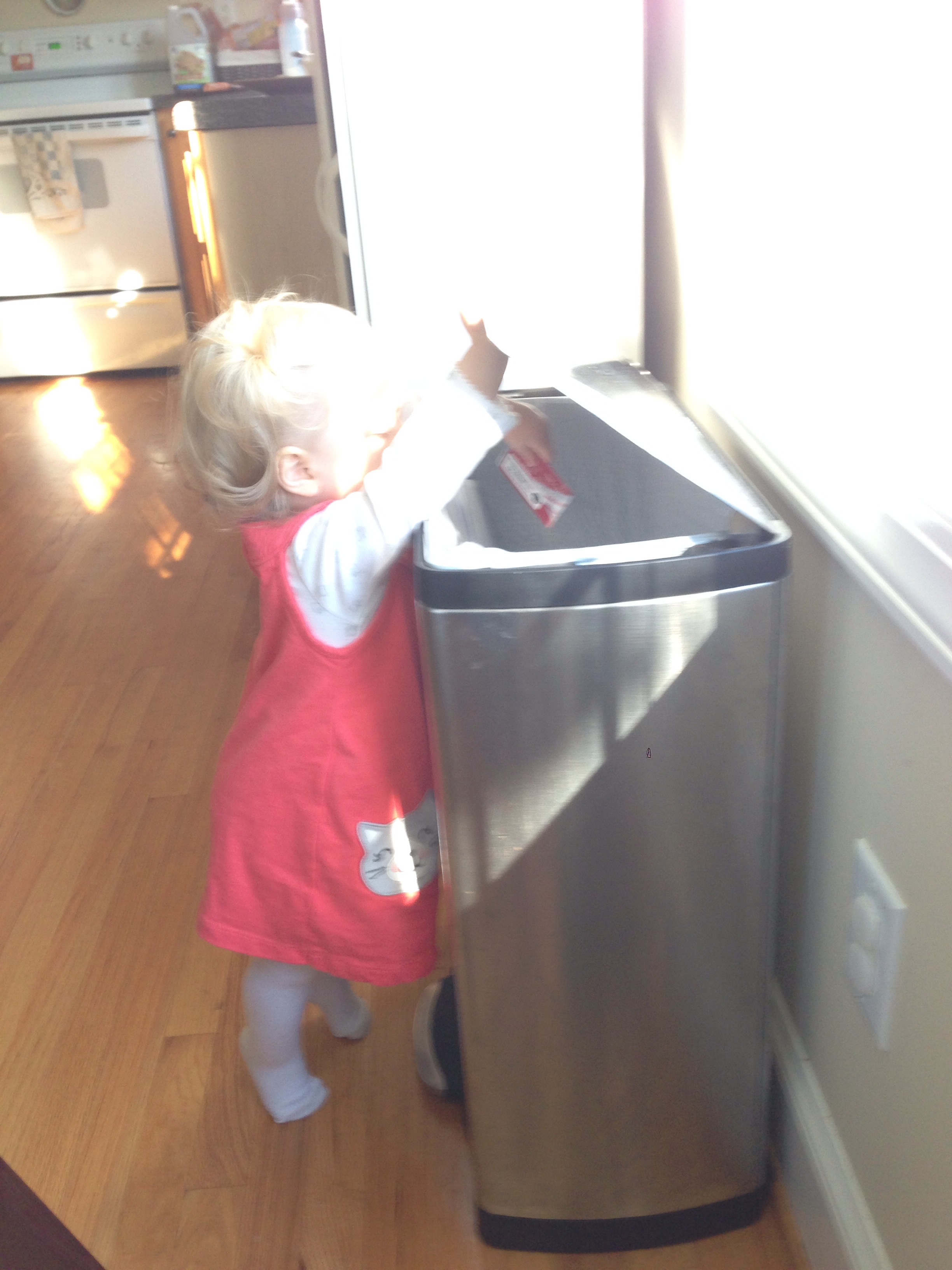 Wonder how many other things have been unknowingly missing? She has been an opener and a closer now for a long time…..Do they make child safety gadgets for garbage cans? I guess, no more using credit cards, uh? Look at her up on her tippy toes!!