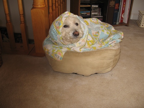The last time my mom was visiting, I nabbed all the pictures off her camera to back up on our external hard drive. Today I decided to actually look through the pictures and found this cruel form of dog torture. Also it should be noted that this is my old baby blanket, and now Kaya’s blanket. Not sure how Marty ended up having a photo shoot with it.
