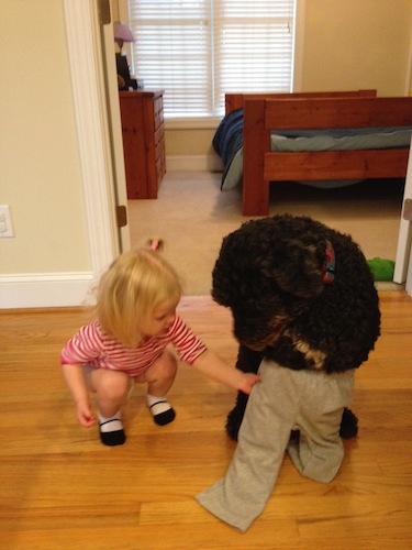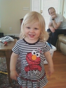 Kaya now likes to pick out her own clothes. Let me rephrase: she throws a tantrum if she doesn’t get to pick out her clothes. Her choices alternate between her elmo pajamas and her rabbit shirt. Today she chose her rabbit shirt with the bottom half of her elmo pajamas. So I chose my pajama pants too.