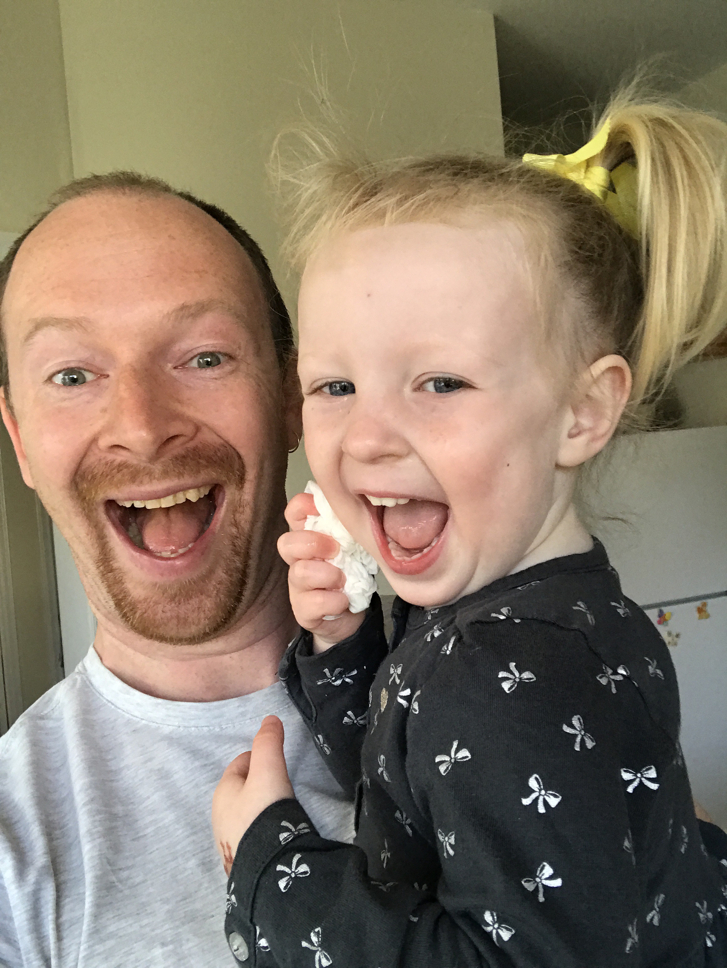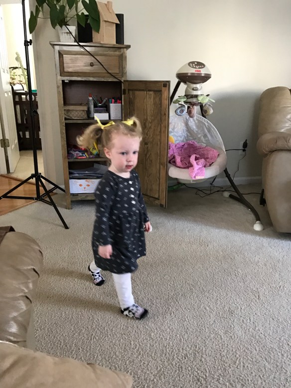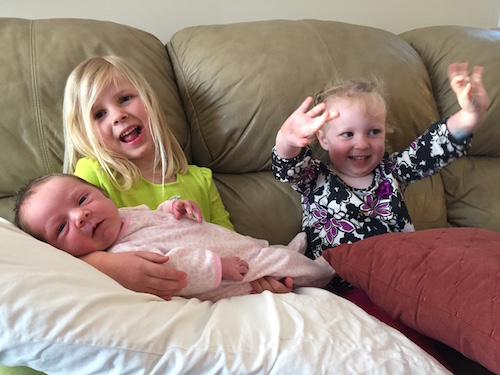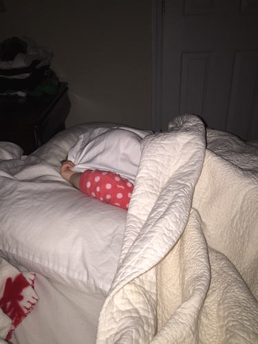Maggie is starting to learn to sleep more than 2 hours at a time. Last night, I was pretty excited when I woke up and it had been almost 4 hours. Unfortunately, though, I woke up because Laney had snuck into my room and climbed in bed with us, which then woke Maggie up. I had to turn on a dim light so I could see in order to tend to Maggie, and then Laney started screaming “too bright! too bright!” I tried to convince her to return to her dark, spacious bed in her own room but she preferred to just complain about the accommodations in our room. Her eventual solution? Sleeping like this.