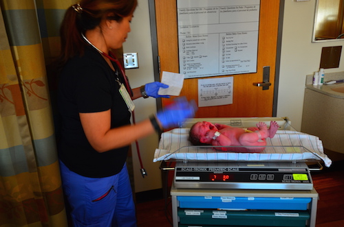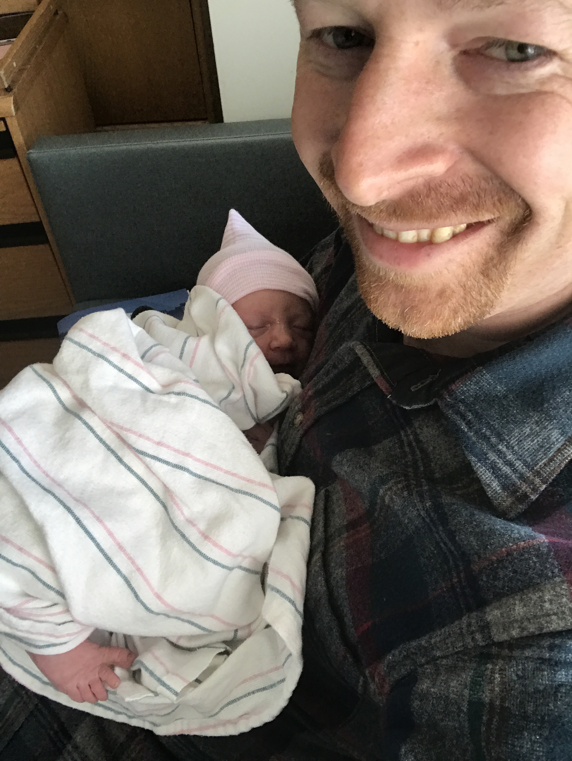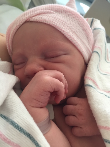 We checked into triage at 7:17. I then was told I was 6cm dilated about 7:40ish, which surprised me as that was a lower number at arrival than with either of my other kids but I felt pretty far through it. Then, within 5-10 minutes, I was trying to find a call button because triage no longer felt appropriate. I then got a tv-worthy ride down the hall to an actual delivery room, where I pushed for 3 minutes and gave birth at precisely 8am. Interestingly, Maggie was born “en caul” (as was Laney) – meaning within her amniotic sac. Laney’s was a water birth so I didn’t get a great look at what was going on, but this time, it was fascinating to see the blue membrane still over her body and face, which was then manually removed gently by our midwife. En caul births are pretty rare, but two has gotta be special. (They are rare enough that our midwife had to gently remind our nurse that it was silly to stimulate the baby to cry when its face is still encased in a sack).