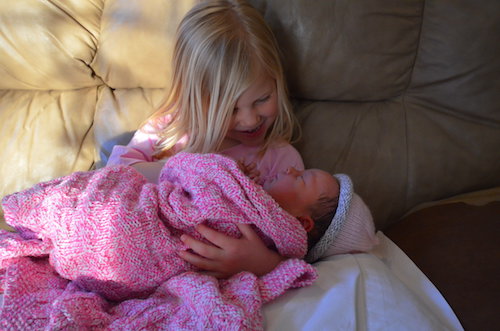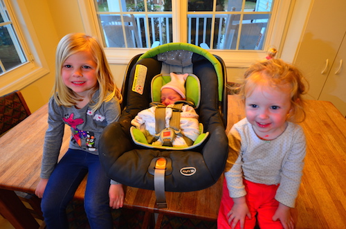 Maggie is settling in just fine at home – she sleeps most of the time, although is still learning day and night, and Kaya and Laney are getting used to a new little sister. Unfortunately, they have both had pretty bad colds for the last 4-5 days so we haven’t been able to let them hold or play with Maggie very much. We shot this picture on day 1 before Kaya started to get sick – she was very excited!