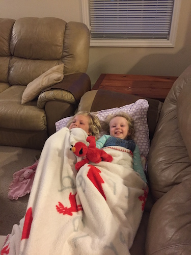 I’m not sure when the fighting phase of siblinghood is supposed to start, but we are clearly in a honeymoon period where Laney is old enough to play with Kaya, but still young enough to willingly follow all of Kaya’s commands and rules. It’s pretty cute watching them play. And since Laney switched into the “middlers” class at school, which shares a playground with the preschool class, she also has the reputation on her school playground of being everyone’s little sister. I commonly pick her up and one of the older kids (Kaya’s old friends) will have her by the hand and will be leading her around the playground. Here’s a picture of the girls after Kaya declared nap time one day (unfortunately, this never actually translates to anyone sleeping).
