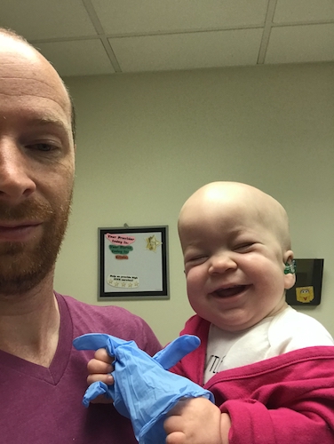 I have officially finished transforming our apartment at Ronald McDonald house into a toddler’s dream house. First, I couldn’t handle the anxiety of a baby with a platelet count of 30K to learn how to walk on hardwood floors, so I covered half the apartment in a play mat. Second, I pushed the two double beds apart and dragged one of the mattresses onto the floor, so I could leave Maggie on a soft surface when needed without risking her falling off a bed (if I had to run in the other room to get a new saline flush because she grabbed the first, as an example that happens all the time). Third, I put a pack and play in the bathroom so she wouldn’t have to sit on the floor and play while I showered. And lastly, I distributed our gigantic amount of medical supplies into a logical and easy to access drawer and cabinet network. Maggie is still doing well, although still looks like she is breathing quite heavy a lot of the time. I spent the night on Wednesday awake counting her respiratory rate (which I counted in the 60’s for a few hours, which is a really high number to me). Her team thinks it is still just her being out shape from transplant + Hurlers + her new post-transplant beer (milk?) belly. Otherwise, she is still getting platelets every couple days, IV magnesium nearly daily, Neupogen every other day or so, and IV infusions at home. But every day of the same is a successful day at this point. Day +42 today!