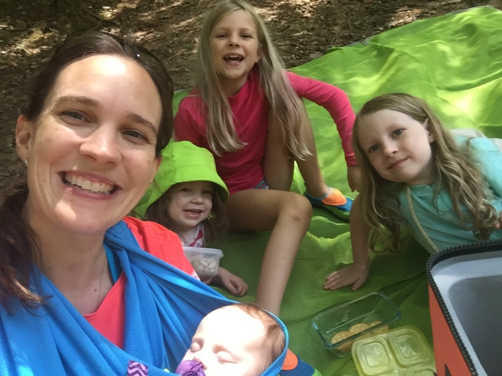 Tommy needed a few hours respite, so I decided I would SuperMom it and take all 4 girls hiking and then swim at the Eno. It was moderately successful – it was so crowded at Fews Ford that I was uncomfortable with my ability to socially distance everyone, so we parked up the Eno a ways and walked along the river until we found a place that was safe for the kids to play in the water. Maggie was a bit of a handful while holding a newborn and there was some chaos, but there were also moments of bliss. This blissful picnic moment captured on film.