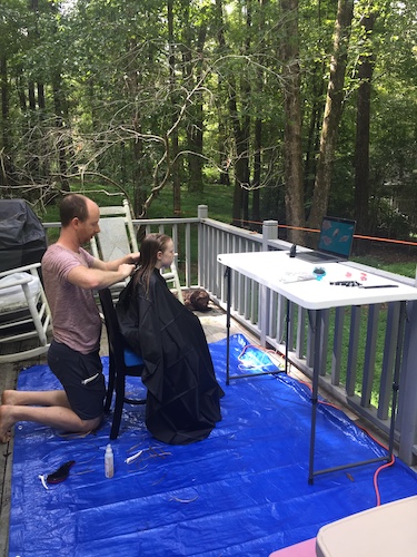 Add ‘hairdressing’ as another skill to which Tommy has demonstrated remarkable proficiency. This incredible ability to be good at everything could be annoying to some, but given that I benefit from it daily, I choose to live in a state between awe and gratitude. Today he gave 4 haircuts (myself and the 3 older girls) – he also has become an adept dog groomer. And it was the most scenic haircut I’ve ever had, as well.