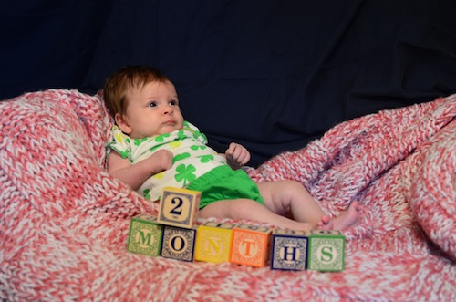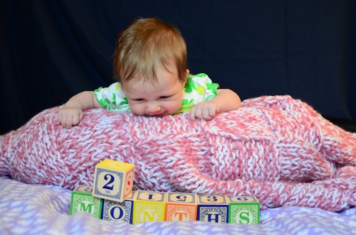 Kaya turned 3 months yesterday. She was in a serious mood – here’s hoping for a smiley picture at 4 months. She’s definitely taken an interest in the blocks though.